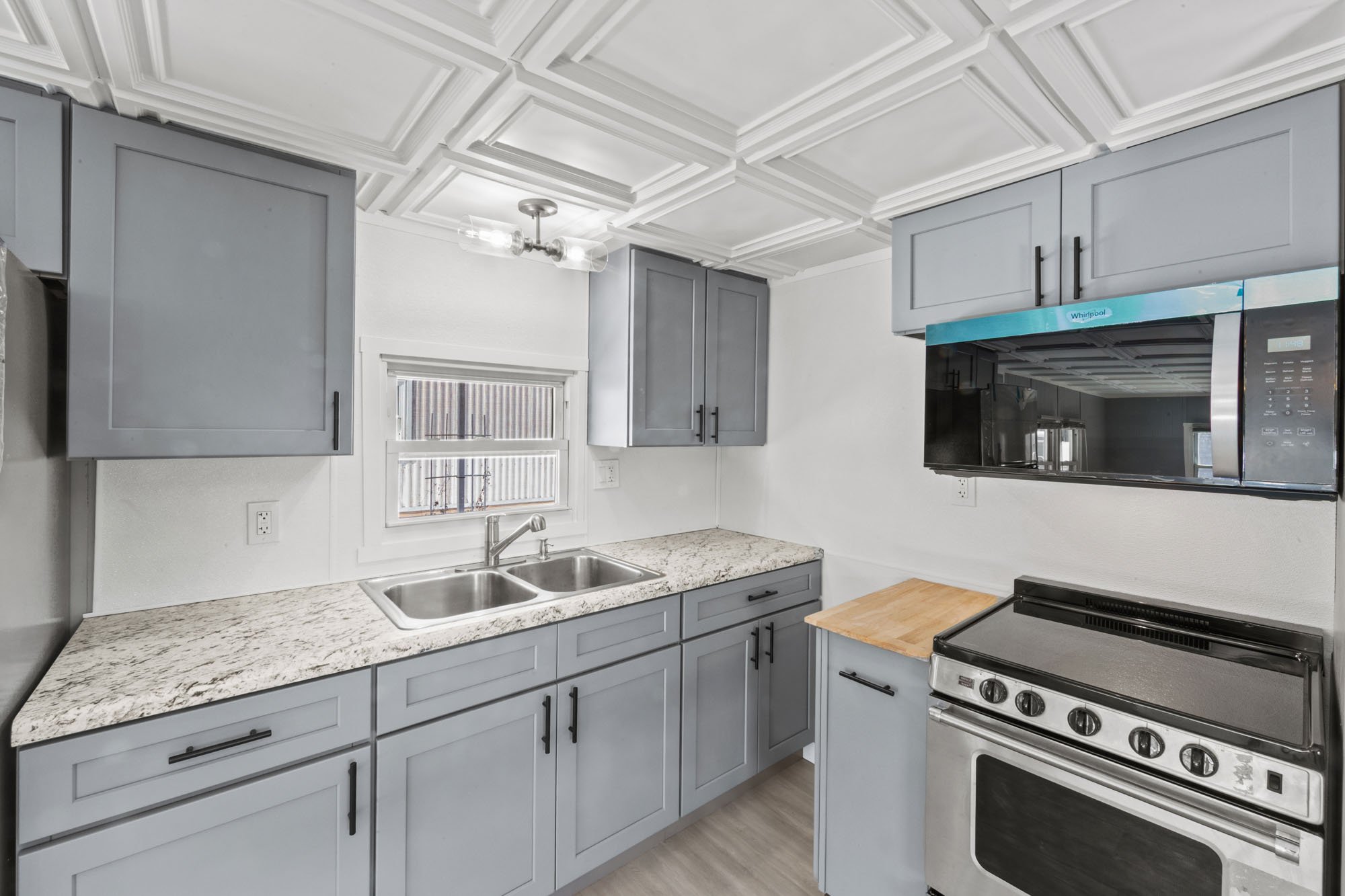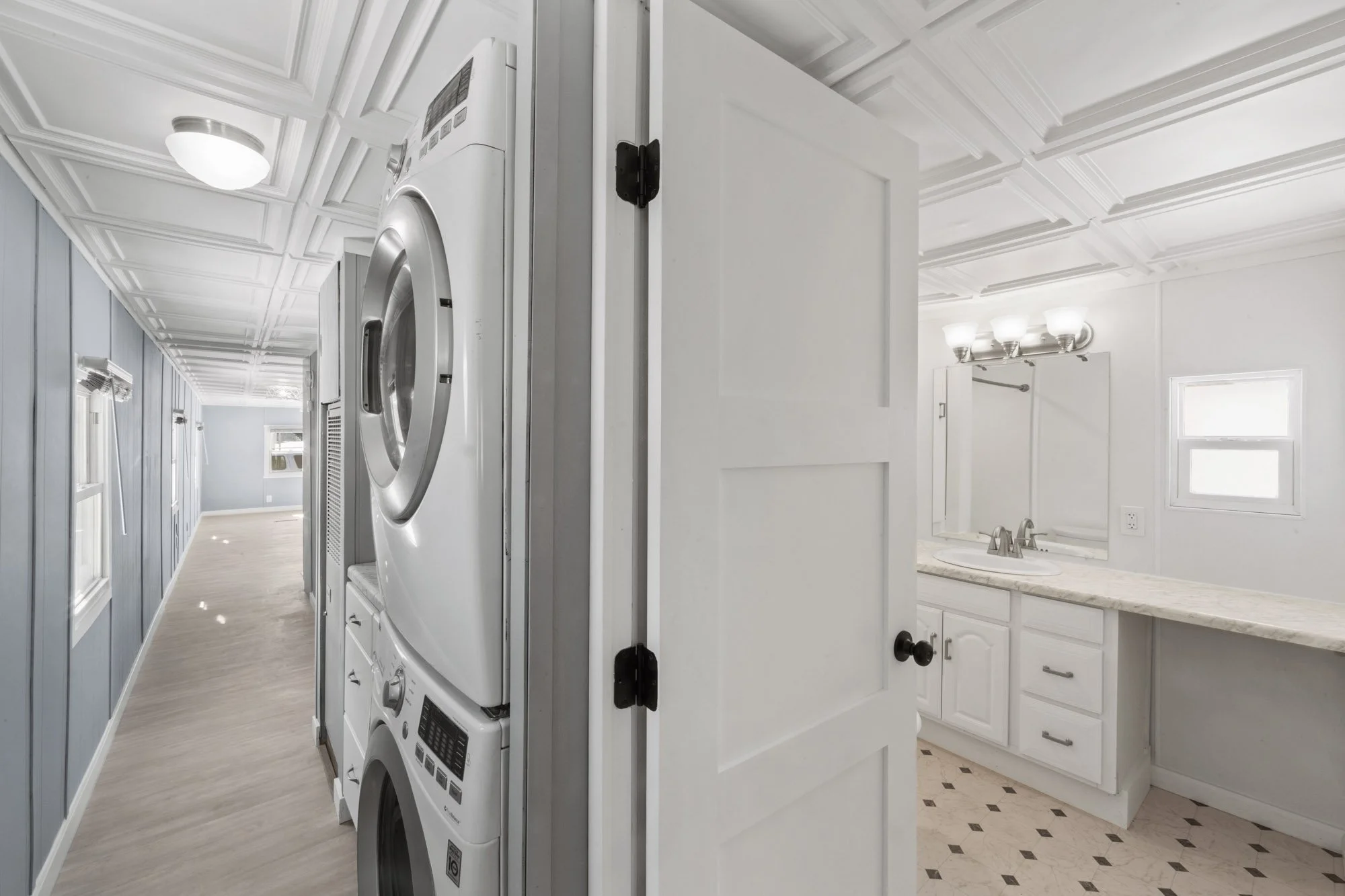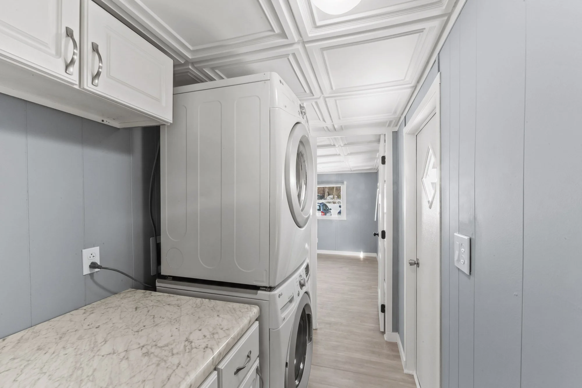 The redesigned kitchen includes shaker cabinetry, new countertops, a double-basin sink with pull-out faucet, stainless Whirlpool appliances (including over-the-range microwave), a floor-to-ceiling pantry, and a movable butcher-block island. The updated bathroom offers a wide step-in shower with safety bar, extended vanity countertop, and generous storage. A dedicated laundry area includes a newer LG stacked washer/dryer, folding workspace, and cabinets.